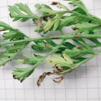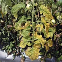 Symptômes : Jaunissement des folioles sur un côté de la plante ou un côté de la feuille (symétrie axiale), vaisseaux marrons.
